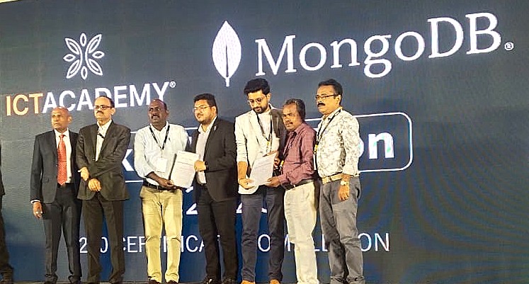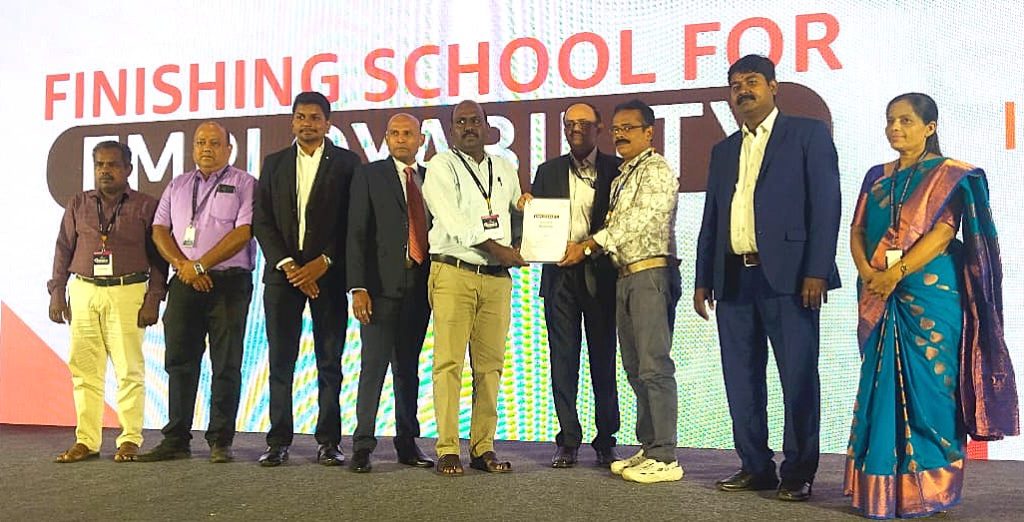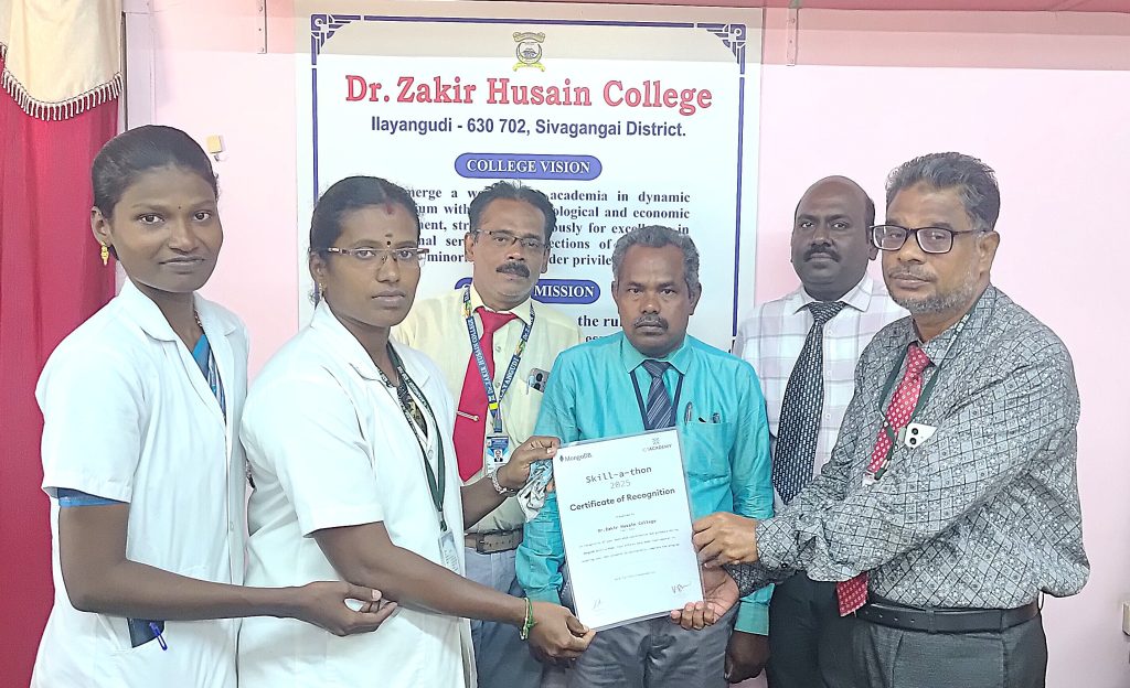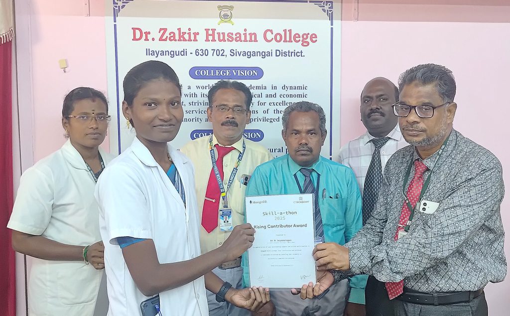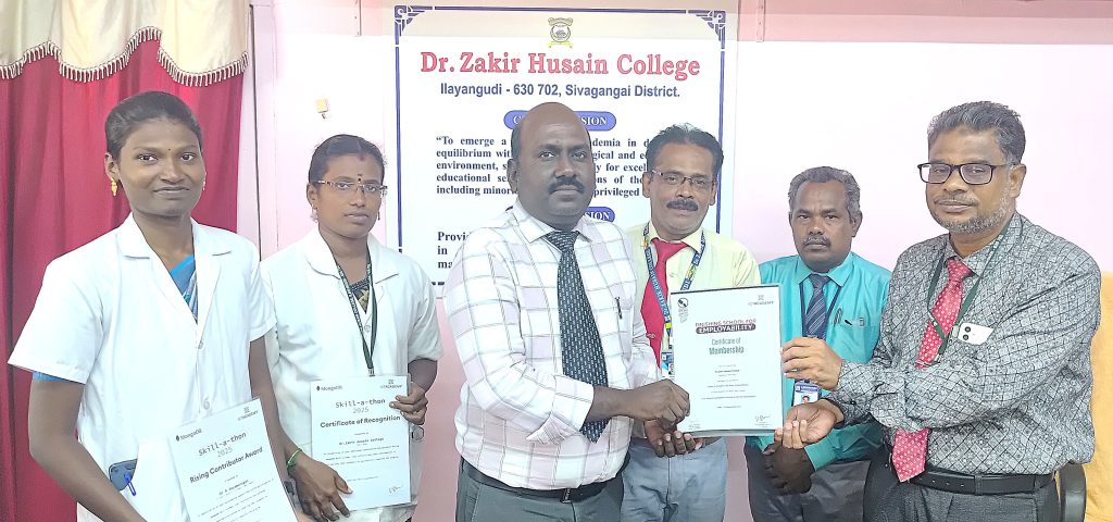 Skill development training is being provided to students on behalf of the Information and Technology Division of the Government of Tamil Nadu (ICT Academy). More than 300 students completed the skill development training and the award was given on behalf of the Government of Tamil Nadu on 25.09.2025. The award was received by the College ICT-Academy Coordinator Dr. R. Jayamurugan. The College Principal Mr. S.E.A. Jabarullah Khan congratulated the students who successfully completed the training and the teachers who coordinated it. Assistant Professors Dr. S. Muthusamy, Dr. S.A. Shamsudeen Ibrahim, Mrs. P. Pandichelvi and Mrs. J. Ando Ebi Rosy were present nearby.