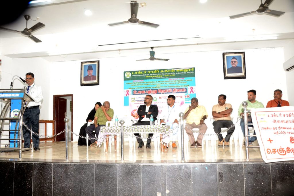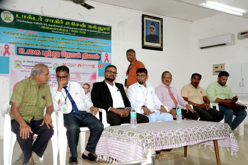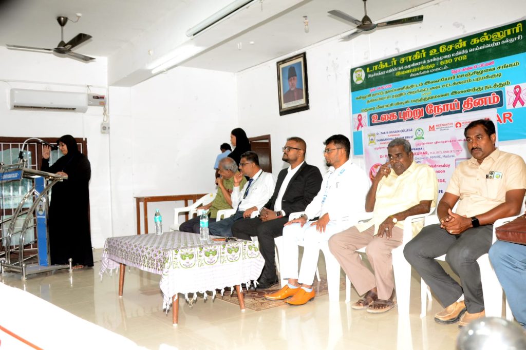 College National Service Scheme, Red Cross Society, Science Club, Emaneswaram, Thangammal Rahim Foundation and sattakalam Newspaper jointly organized a Cancer Eradication Awareness Seminar on the occasion of International Cancer Day on 04.02.2026. Assistant Professor Dr. E. Roshan Ara Begam welcomed the guests. College Principal Mr. S.E.A. Jabarullah Khan delivered the keynote address. Thangammal Rahim Foundation Founder Dr. Muhammad Ali Jinnah and Former Economics Department Head Dr. A.T.N. Abubakar delivered the felicitation address. Senior Oncologist Anantha Krishnan, Meenakshi Hospital, Madurai, participated as the special guest and spoke about the mechanisms of cancer, the need to detect it at an early stage and provide appropriate treatment. He answered the doubts and questions raised by the students at the event. The event was hosted by Assistant Professor Dr. A. Affrose. Finally, Assistant Professor Mr. S. Kader Meeran proposed the vote of thanks. The event was attended by Professors and students including Self-financed Courses Director Dr. A. Sabinullah Khan, Vice-Principal Dr. A. Mushtaq Ahmed Khan.