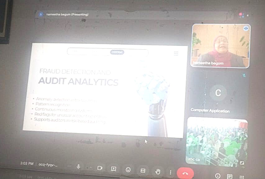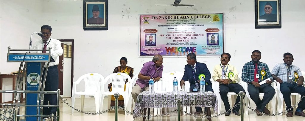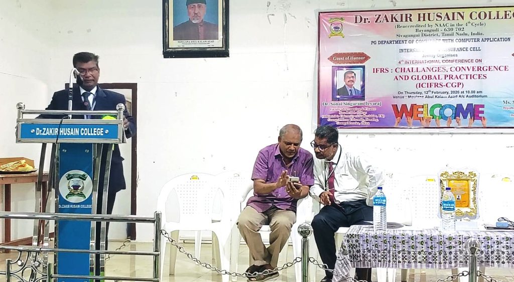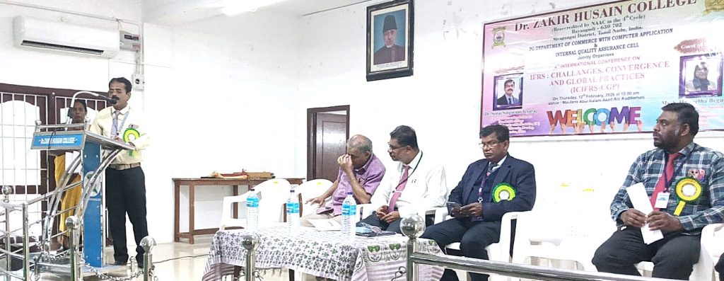 The Department of Postgraduate Commerce (with computer applications) organized an International Seminar on the topic “International Financial Reporting Data Standards – Challenges, Integration and Global Practices” on 12.02.2026. The Head of the Department, Dr. S.A. Shamsudeen Ibrahim welcomed the participants. The Principal of the College, Mr. S.E.A. Jabarullah Khan inaugurated the seminar and delivered the keynote address. The Director of Self-Finance course, Dr. A. Sabinullah Khan offered felicitation. The special guests in the first session were introduced by Assistant Professor Dr. S. Arafat Ali. The special guest was Dr. Sonai Singharam Jayaraj, Professor, Department of Accounting, Guangxi Minzu University, Sino-British College, China.